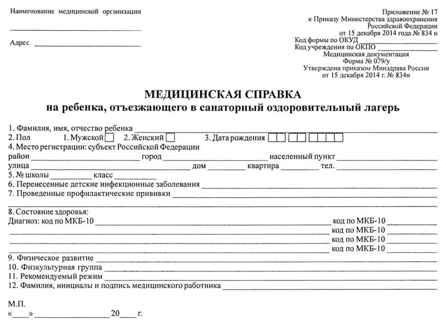 Такой документ на основании Приказа Минздрава № 834н от 15.12.2014 имеет стандартную форму и состоит из двух частей. В первой содержится санаторная справка и заполняет её педиатр во время обследования до отъезда в лагерь. Вторая часть на оборотной стороне заполняется медицинским работником санитарно-оздоровительного учреждения после окончания срока пребывания и возвращении домой.